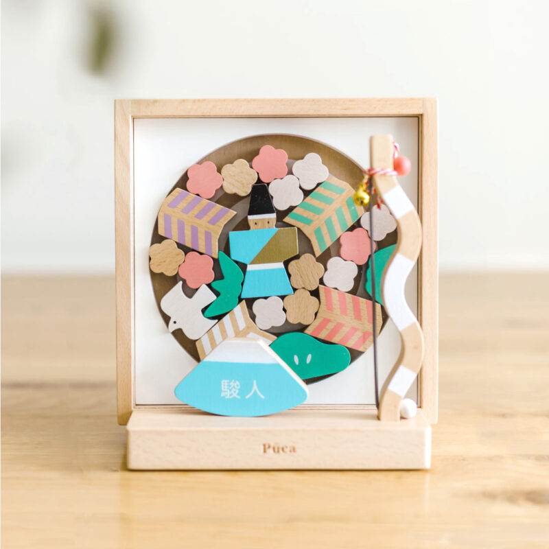 積み木やパズルのように遊べる、おしゃれで安全性の高い素材の羽子板。飾るだけでなく、子どもが触れて楽しめる工夫がされています。